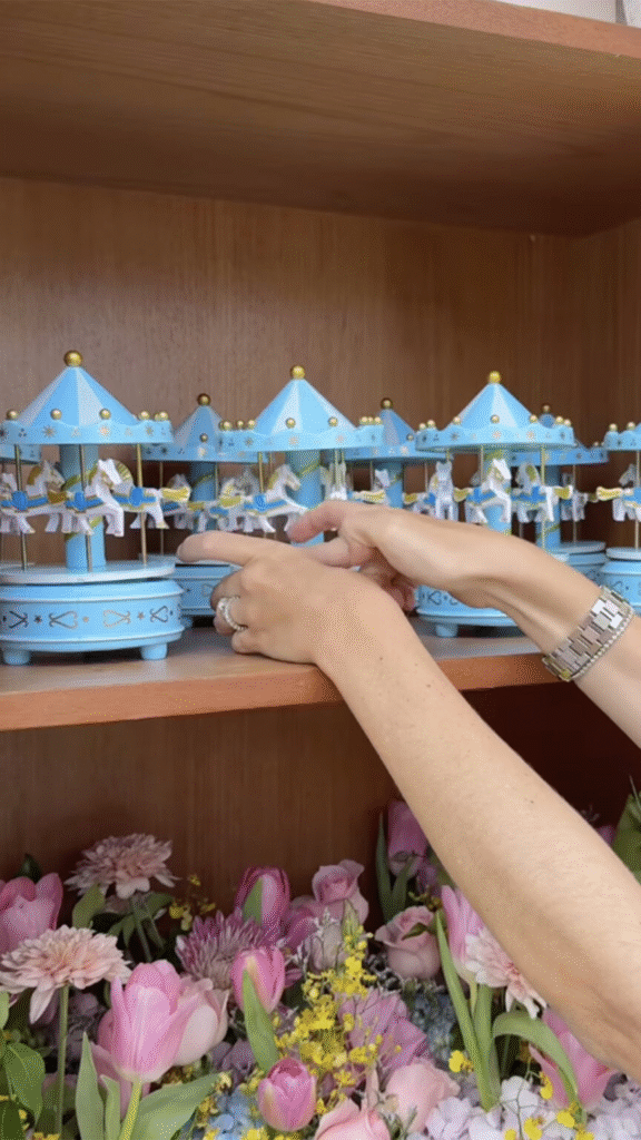 As lembrancinhas das crianças eram um carrossel de brinquedo nas cores rosa ou azul e também um livro de colorir com lápis de cor e com a estampa da festa. Enquanto isso, as mães receberam vasos de flores de vidro decorados. Os detalhes foram exibidos por Nicole Sarfaty, que foi a responsável pela decoração da festa intimista.
