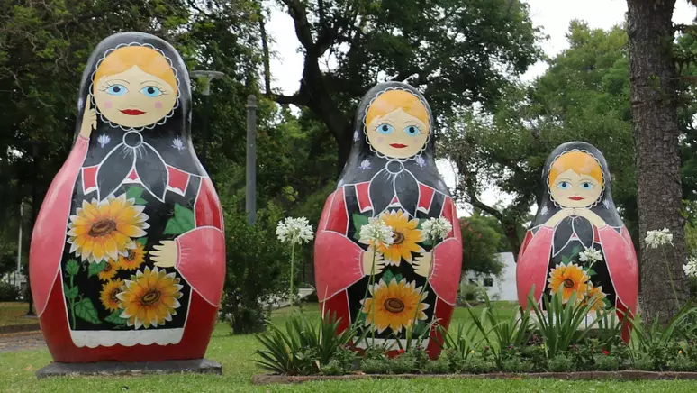 Em San Javier, há vários sinais das raízes russas, como as matrioskas – Foto: BBC News Brasil
